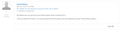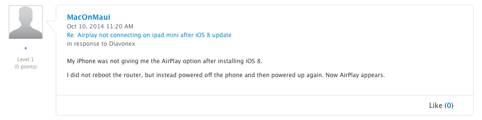 この記事の要旨: iOS 8 にしたあとで AirPlay できなくなった場合、iOS デバイス (iPhone, iPad) の電源を一度切って、入れなおしてみましょう。